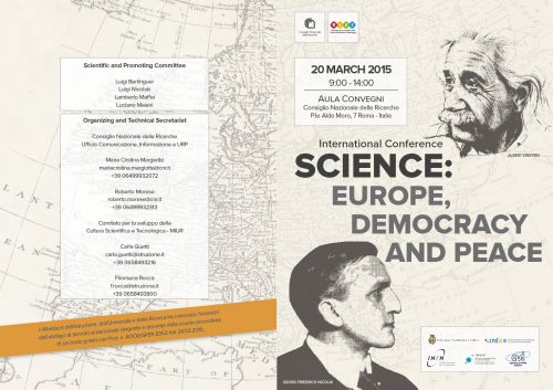 Il prossimo 20 marzo presso la sala Convegni del Cnr si terrà, dalle 9.00 alle 14.00, la Conferenza internazionale “Science: Europe, Democracy and Peace”.