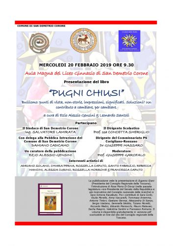 Mercoledi 20 febbraio 2019 alle ore 9.30 nell'aula magna del Liceo Ginnasio di San Demetrio Corone (Cosenza), presentazione del libro 'Pugni chiusi. Bullismo: punti di vista, non-storie, impressioni, significati. Soluzioni? Un contributo a cambiare, per cambiare', a cura di Ezio Alessio Gensini e Leonardo Santoli. Partecipano il Sindaco di San Demetrio Corone Salvatore Lamirata, la prof. ssa Concetta Smeriglio, il dirigente scolastico Damiano Cadicamo, il dirigente del commissariato PS Corigliano-Rossano Giuseppe Massaro, l'autore Ezio Alessio Gensini e il moderatore prof. Giuseppe Garofalo.