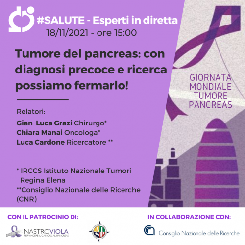 Il 18 novembre ricorre la giornata per la sensibilizzazione alla lotta contro il tumore al pancreas. All'iniziativa, promossa dall'Istituto nazionale tumori Regina Elena, aderisce anche il Consiglio nazionale delle ricerche. Il particolare tema sarà posto in risalto illuminando di viola luoghi simbolici e promuovendo iniziative di informazione e prevenzione.