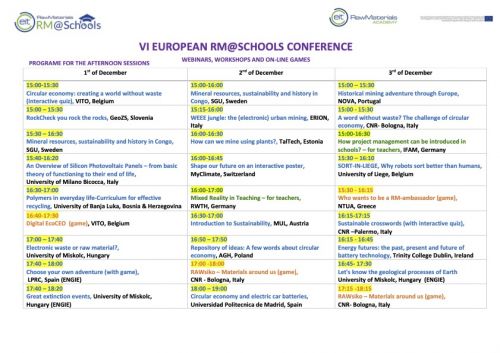 Nelle tre sessioni pomeridiane (dall'1 al 3 dicembre) gli studenti delle scuole secondarie di secondo grado potranno usufruire di webinar interattivi e serious game erogati dai partner del progetto in collegamento diretto con una quindicina di paesi europei diversi. Gli studenti potranno quindi aumentare le loro competenze trasversali sui temi delle materie prime e della transizione verso l'economia circolare, fare pratica della lingua inglese, confrontarsi con il mondo delle aziende e della ricerca e incontrare coetanei da tutta Europa, per quanto virtualmente, realizzando così lo spirito comunitario che anima l'Unione europea.