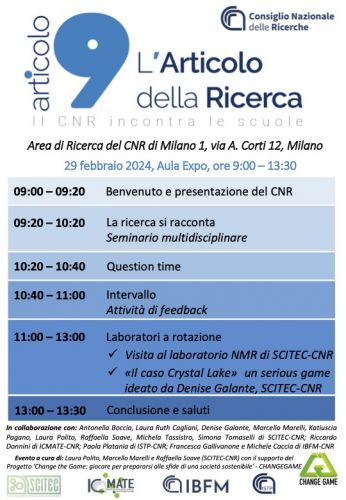 Durante l’evento che si terrà il 29 febbraio 2024 dalle ore 9 alle ore 13.30 in sala Expo, presso l’Area della Ricerca di Milano 1 di via Corti n 12, i ricercatori e le ricercatrici, partendo proprio dalla riflessione sull’articolo 9, presenteranno il CNR e la sua multidisciplinarietà a 40 studenti e studentesse della classe quarta del liceo scientifico opzione scienze applicate dell'Istituto di istruzione superiore “Marie Curie-Piero Sraffa” di Milano. Il programma sarà articolato su una proposta che alternerà la divulgazione di alcuni specifici ambiti della ricerca a momenti di interazione e conoscenza delle infrastrutture scientifiche.