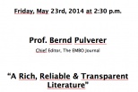 Bernd Pulverer, Chief Editor of the EMBO Journal, will give an overview on the peer reviewed research paper which remains the main conduit for the exchange of research discoveries. With the growth and diversification of global research, publishing in selected journals and citation metrics are increasingly employed as surrogates for quality in research assessment. Consequently, the pressures to publish in only a handful of journals have increased, with the risk of hampering scientific progress. EMBO has implemented a 'transparent process' that ensures a fast, fair and informed editorial decisions. EMBO is also recasting the paper as a rich online resource that ensures the discoverability and reproducibility of research findings. Pulverer will also discuss how to optimize your chances to succeed in getting your research published as well as research ethics.