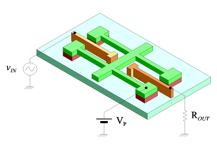 In Fig.1 a schematic view of the clamped-clamped beam in a dual port configuration is shown: the beam is electrostatically driven by one electrode and the motion is detected by using the capacitance variation between the beam and the other electrode. To vibrate, an AC drive voltage vIN is applied to the electrode and the resulting beam motion is detected as current flowing in the output resistor ROUT. When the microstructure is driven at its resonance frequency, its motion and the output current reach their maximum amplitude. The DC voltage VP serves two purposes: (i) avoiding that the microstructure moves at twice the frequency of the applied drive voltage and (ii) amplifying the output device current due to the beam motion.
