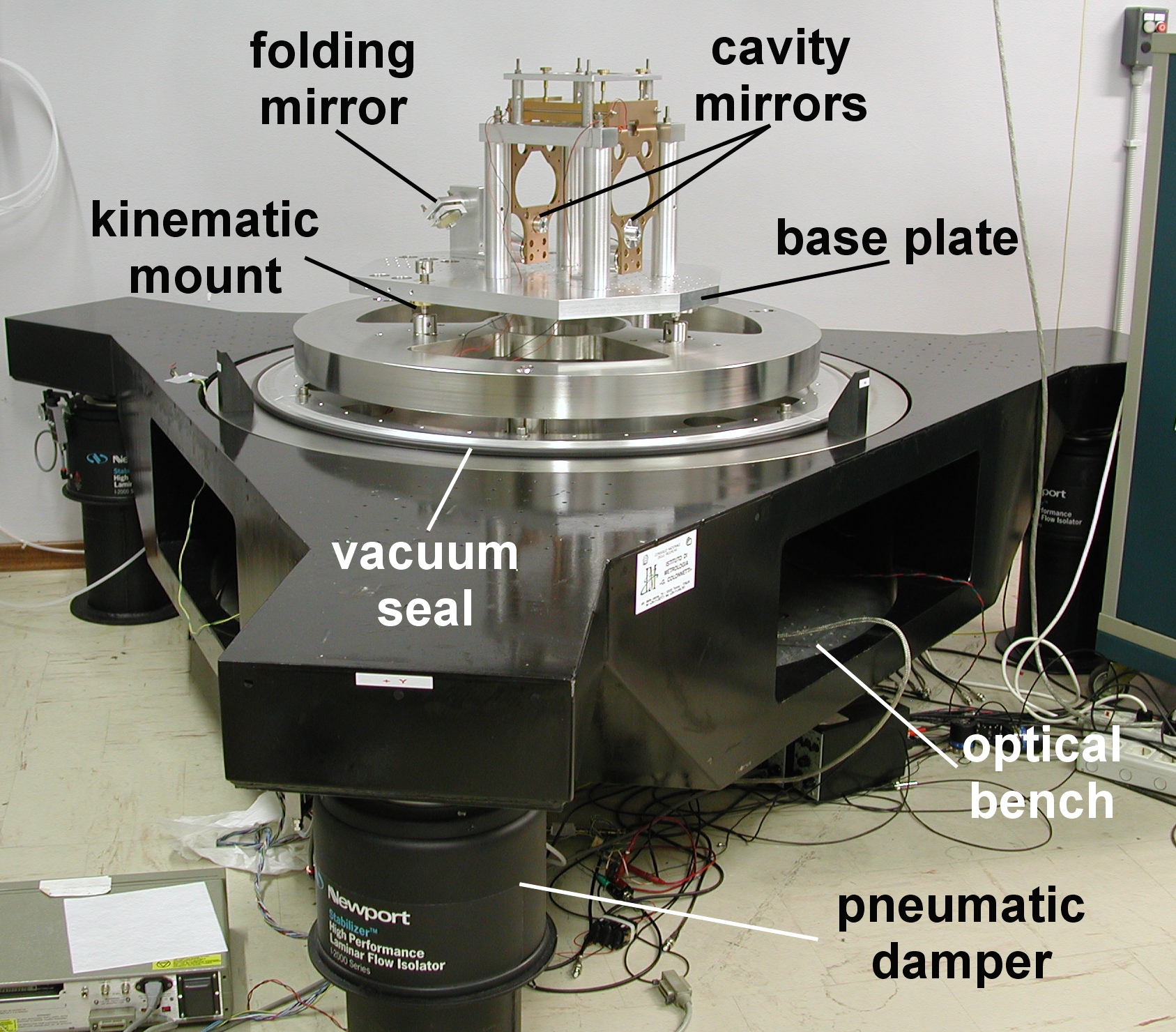 The experiment is performed in vacuum, in order to get rid of the refractive index fluctuations and to improve acoustic and thermal isolation.