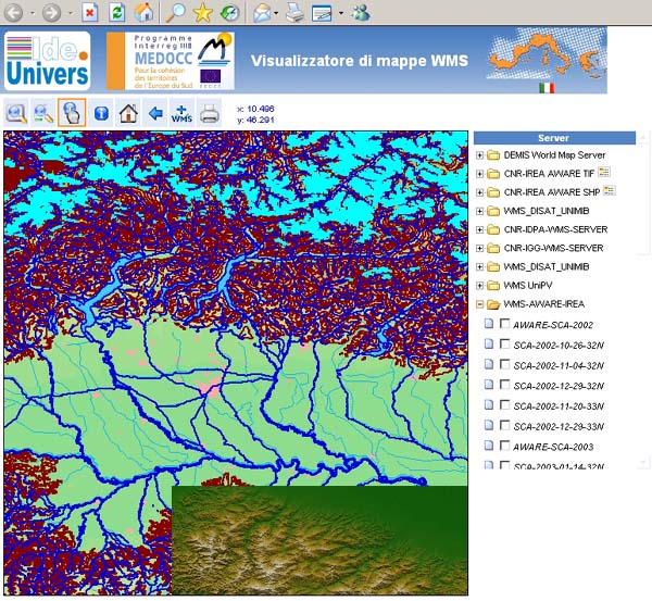 All above services can be accessed through the Internet and users can exploit them by a geoportal offered by IREA online facilities (http://geoportal.irea.cnr.it:8080/geoportal/local_it.jsp) (figure 2). However, following infrastructure philosophy, any access point with the same standard rules can access IREA services as well: so burned area maps of Italian Parks can be perfectly overlaid to the maps visualised in the Portale Cartografico Nazionale of the Italian Ministry of Environment; maps of the extension of glaciers can be seen through the Map client of the Joint Research Center in Ispra; the service that evaluates water runoff in a mountain basin can be feed with maps hosted by different SDIs of other providers in Europe.