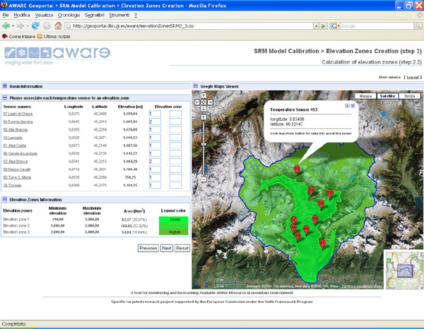 The infrastructure has been implemented by free software, in different operation environments (Linux and MS Windows) to test its behaviour in heterogeneous systems. Created Web services follow OGC (Open Geospatial Consortium) standards and allow different functions. First of all a Web Catalog Service (CSW) to explore available data by querying their metadata (i.e. information describing the data); at present they are about 850. This way it is possible to know, by example, all data produced by IREA in 2007 referred to Lombardia. Web Map Services (WMS) and Web Feature Services (WFS) let visualise/analyse images and maps produced in the various researches; this data collection mainly refers to Northern Italy. IREA SDI contains also some Web Processing Services (WPS) to elaborate spatial data, in particular a module to evaluate river runoff from both meteorological data and maps of snow cover (figure 1).