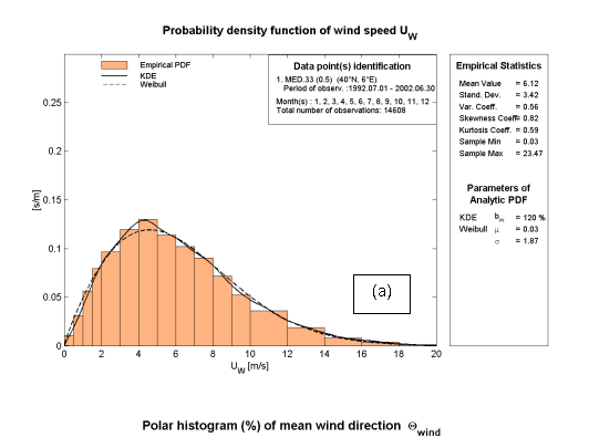 Given the ten years of data at disposal, extensive statistics have been obtained, concerning both the single points (e.g., the frequency distribution of the wave heights) and the overall basin (distributions of the extreme values, main flow directions, etc.). The overall results have been published as the wind and wave atlas, MEDATLAS, of the Mediterranean Sea, available in paper and electronic formats. The attached figures show the cover and some maps from the atlas.