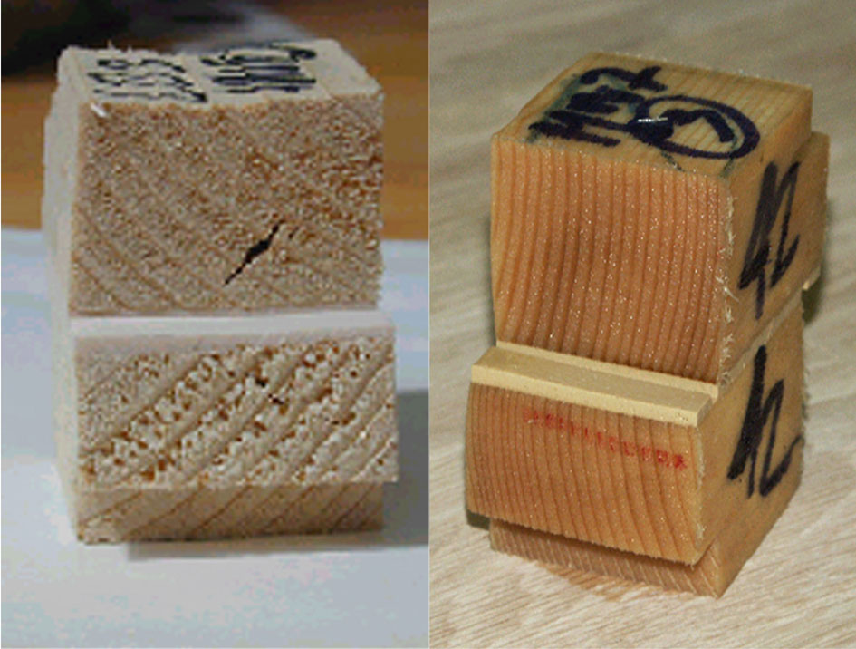 In order to obtain an adhesive highly compatible with wood it is necessary to point out a specific test taking in account the two main factors characterising the on-site bonding of timber: a thick glueline of the joint and the application of the adhesive without pressure. A new geometry for the shear test specimens was then developed in such a way that a direct comparison is possible between the shear strength of the bondline and the actual shear strength of wood, both measured on the same specimen (fig. 1). In fact each specimen is tested twice in shear: