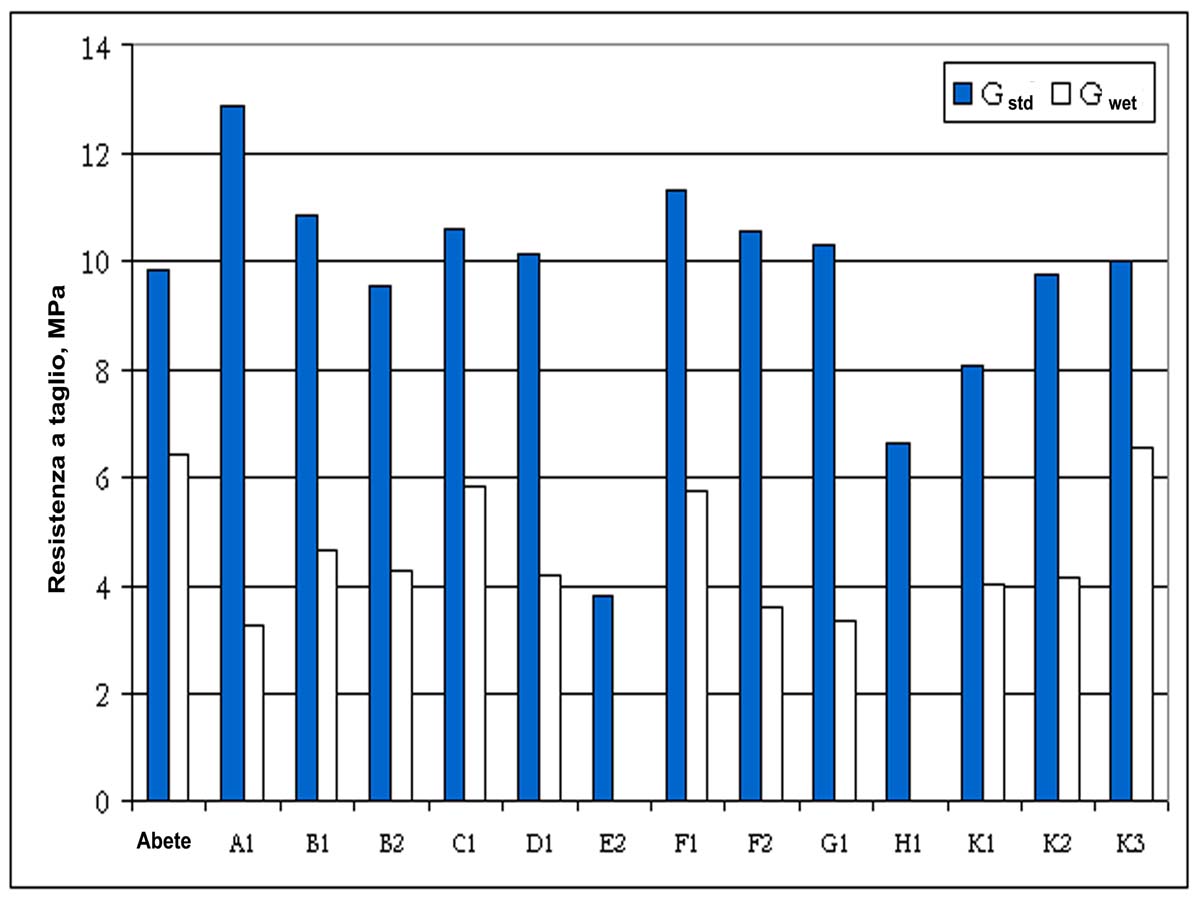 o the first loading step is at the wood-adhesive interface (fig. 1a), with an offset equal to the adhesive's thickness (3 mm in our case), both in standard and completely wet conditions after some accelerated ageing cycles (fig. 2);