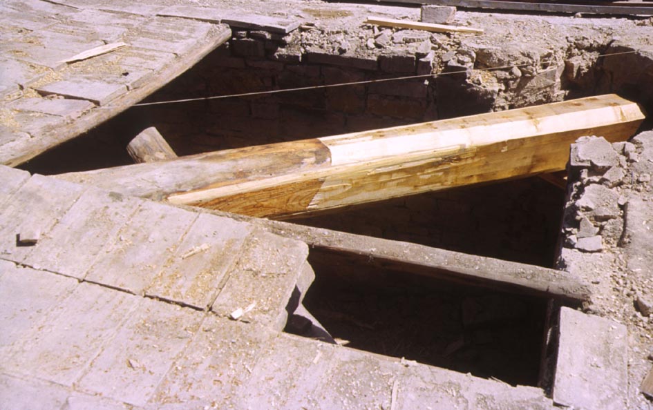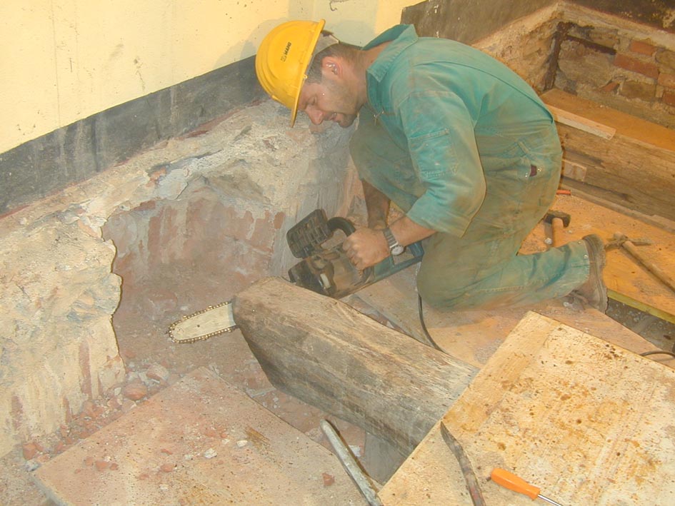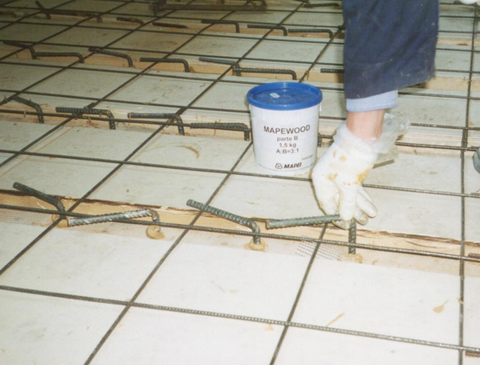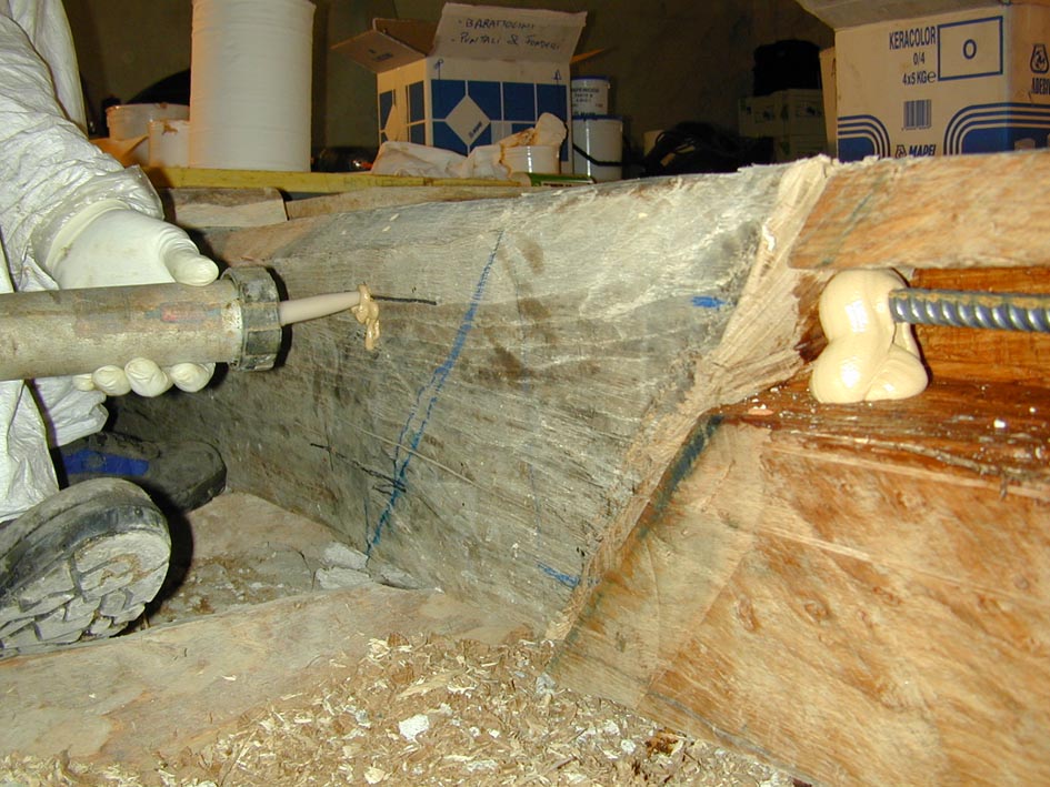 By this approach a mechanical compatibility coefficient can be calculated based on the real values of shear strengths as related to the same wood batch used for the glue. The methodology has been therefore applied both to commercial and experimental products (fig. 3), thus demonstrating that the majority of the adhesives actually commercialised for structural wood repair are non suitable for such application, whereas a set of new specific products has been developed. Moreover a classification of adhesives could be proposed that is referred to numerical values and then to impartial evaluations. The new adhesives set up during the Project have been applied on some real experimental yards (figg. 4-14).
