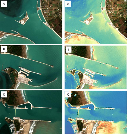 The different timing of the operations in the inlets clearly affects the patterns of water turbidity, as apparent in the 10 m spatial resolution Sentinel-2 image and turbidity maps of Figure 1. For instance, in the inlet of Chioggia the turbidity is slightly higher on the sea side of the gates. In the inlet of Malamocco a zig-zag pattern is visible at the centre of the channel, where the accumulated sediments are likely mobilized by the turbulence associated with the retreat of the gates. In the Lido inlet, it is noteworthy the peculiar behaviour of the S. Nicolò Channel where the different relative position reached at the time of acquisition by the 20 mobile gates force the flow to move through openings of variable depth, creating a sawtooth-like pattern in the turbidity front. Another outstanding feature of the image is the low turbidity of the seawater trapped into the refuge harbours of the navigation locks in Malamocco and Chioggia inlets, that are hydraulically isolated from the circulation in the nearby channels.