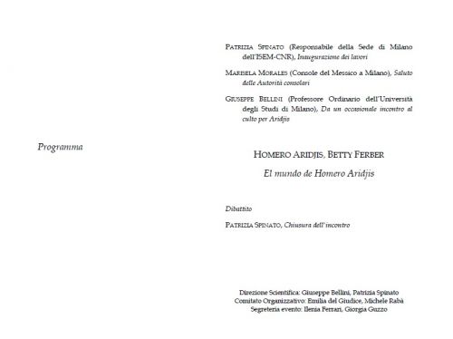 L’ospite e la sua vasta opera – oggetto, fra l’altro di un illuminante e approfondito studio di Giuseppe Bellini, 'I tempi dell’Apocalisse. L’opera di Homero Aridjis' (Roma, Bulzoni, 2013) – sono stati presentati dalla responsabile della sede Isem-Cnr di Milano Patrizia Spinato. Presente anche il Console del Messico Marisela Morales, che ha portato il saluto delle autorità diplomatiche e tracciato un profilo dell'autore. Giuseppe Bellini ha dedicato all'ospite e amico messicano un intervento intitolato: 'Da un occasionale incontro al culto per Aridjis'. Homero Aridjis e Betty Ferber hanno, quindi, tenuto una conferenza intitolata: 'El mundo de Homero Aridjis'.