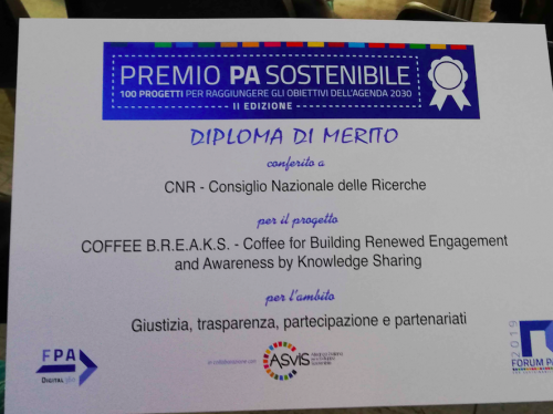 'Coffee Breaks',, il progetto che negli ultimi 2 anni ha coinvolto i dipendenti del del Consiglio nazionale delle ricerche nella definizione di una proposta di sistema di valutazione, presentata ufficialmente al Direttore generale e al Presidente durante la giornata conclusiva dello scorso 9 gennaio 2019, ha ottenuto un altro importante riconoscimento ieri, 15 maggio, al Forum PA.