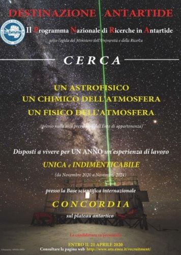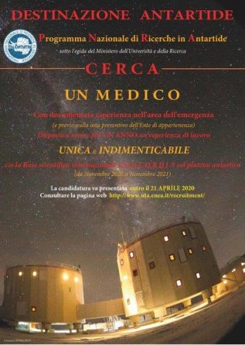 Il PNRA (Programma nazionale di ricerche in Antartide) procede annualmente alla composizione e alla formazione del gruppo scientifico-tecnico-logistico per le attività da svolgere nel continente antartico. Data la necessità di avvalersi della collaborazione di alcune figure professionali per le attività di cosiddetto 'Winter Over', è stato pubblicato l''Avviso di interesse per la partecipazione alla XXXVI spedizione italiana in Antartide presso la stazione Concordia nel periodo Novembre 2020-Novembre 2021'.