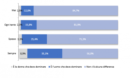Per meglio indagare la diffusione di questi condizionamenti sociali, è stata misurata l’adesione all’idea dell’esistenza di specifici ruoli sociali di genere, che è diretta conseguenza dell’interiorizzazione degli omonimi stereotipi. “In questo caso, viene fornito agli adolescenti un elenco di ruoli e azioni, e chiesto di indicare chi sia più portato a ricoprirli o compierle: gli uomini, le donne o se il sesso sia irrilevante. Un’adesione medio-alta ai ruoli di genere maschili, che attribuiscono agli uomini determinate capacità o attività come: comandare a lavoro, fare il presidente, fare il poliziotto, guidare, giocare a calcio, giocare ai videogiochi, combattere nello sport, guadagnare tanto e fare lo scienziato, si rintraccia nel 36,7% degli adolescenti, ed è nettamente più diffusa tra i rispondenti di sesso maschile (49,6% maschi e 18,4% femmine). Si posizionano invece su un’adesione medio-alta ai ruoli di genere femminili, richiamati da attività quali: cucinare, danzare, insegnare, occuparsi dei figli, pulire, fare la spesa, parlare per molto tempo al telefono e leggere, il 20,4% degli adolescenti, con un’importante prevalenza ancora maschile (26,9% maschi e 11,3% femmine). A fronte di una bassa adesione ai ruoli di genere maschili, che si ritrova nel 26,3% dei casi (25,6% maschi e 27,3% femmine), sono esenti dall’ideale dell’uomo in quanto figura forte e di comando il 37% dei rispondenti (24,8% maschi e 54,3% femmine). Diversamente, presentano una bassa adesione ai ruoli di genere femminili il 38,5% degli adolescenti (42,3% maschi e 33,1% femmine). L’ideale della donna in quanto figura sociale di cura e accudimento è invece rifiutato solo dal 41% degli adolescenti (30,8% maschi e 55,6% femmine) (Fig. 2), prosegue Tintori.