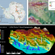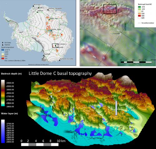 Figura 1. In alto a sinistra: mappa dell’Antartide con indicata l’area di Dome C (rettangolo nero). In alto a destra: mappa di Dome C con indicata nel rettangolo nero l’area di perforazione a Little Dome C (LDC). Figura in basso: mappa dettagliata della topografia del substrato roccioso nell’area di LDC, localizzata a circa 40 km a SW della Stazione Concordia. La freccia verticale bianca indica il sito di perforazione selezionato. L’estensione dei laghi subglaciali (blu scuro) è stata dedotta dai rilievi radar.