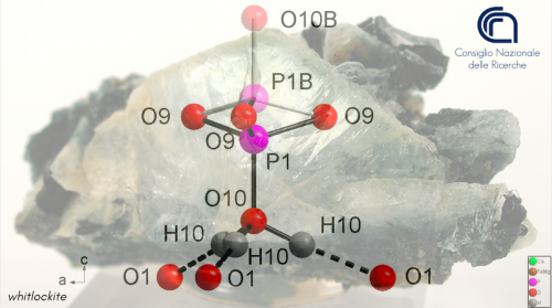 Whitlockite, which has the ideal formula Ca9Mg(PO4)6[PO3(OH)], is a rare natural calcium phosphate found in granite rocks. It is retrieved also in chondritic meteorites, along with its de-hydrogenated analogue, the mineral merrillite (the most important reservoir of phosphate phosphorous in the Solar System), making it a natural phase largely studied in planetary science.