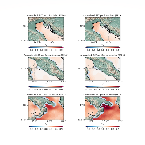 Immagine 2: differenza tra il valore della temperatura superficiale del mare durante gli eventi verificatisi in alcune macroaree e il valore medio climatologico