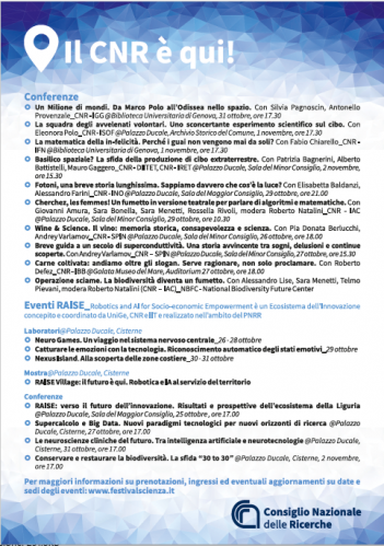 Ogni giorno il RAISE Village propone, laboratori, dimostrazioni e conferenze: tra i primi si segnalano in particolare e “Neuro games. Un viaggio nel sistema nervoso centrale” (26 e 28 ottobre, a cura di Cnr-Scitec) e “Nexus Island. Alla scoperta delle zone costiere” (30 e 31 ottobre, a cura di Cnr in collaborazione con European Molecular Biology Laboratory). Il progetto, inoltre, è al centro delle conferenze “RAISE: verso il futuro dell’innovazione. Risultati e prospettive dell’ecosistema della Liguria” (Palazzo Ducale, Sala del Maggior Consiglio, 25 ottobre ore 17), “Supercalcolo e big Data. Nuovi paradigmi tecnologici per nuovi orizzonti di ricerca” (Cisterne di Palazzo Ducale, 27 ottobre ore 17), “Le neuroscienze cliniche del futuro. Tra intelligenza artificiale e neurotecnologie” (Cisterne di Palazzo Ducale, 31 ottobre ore 17) e “Conservare e restaurare la biodiversità. La sfida 30 to 30” (Cisterne di Palazzo Ducale, 2 novembre ore 17, in collaborazione con NBFC).