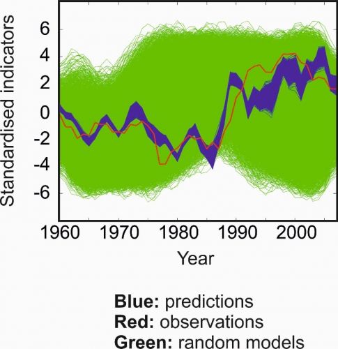 Figura 1. Confronto tra andamenti temporali in comunità marine: Previsioni ‘Metal’, 10,000 simulazioni (blu) e dati osservati (rossi), utilizzando un'analisi sintetica che combina 14 regioni oceaniche. Le curve verdi mostrano i risultati usando modelli random ed evidenziano l’accuratezza delle previsioni ‘Metal’.