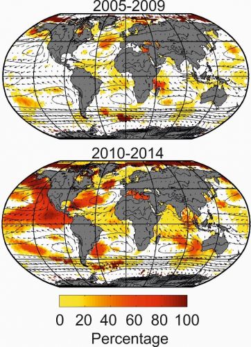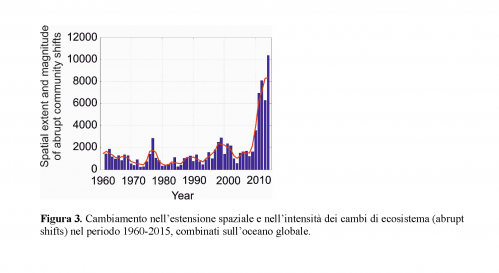 Figura 3. Cambiamento nell’estensione spaziale e nell’intensità dei cambi di ecosistema (abrupt shifts) nel periodo 1960-2015, combinati sull’oceano globale.