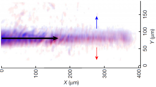 Figura 2. The polariton beams with different polarization (blue and red) propagate inside the device (to the right, black arrow) and are laterally bent in opposite directions (up and down, blue and red arrows), depending on the different curvature acting on their vector charge (which is, on their polarization). Credits: the journal.