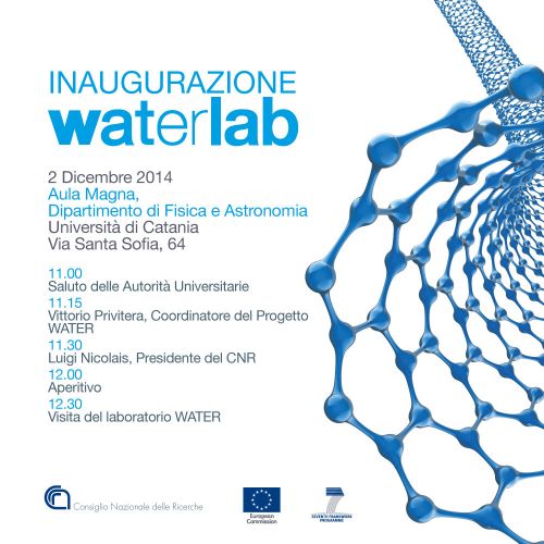 Giorno 2 Dicembre 2014 presso l'Aula Magna del Dipartimento di Fisica e Astronomia dell'Università di Catania si terrà l'inaugurazione del laboratorio WATER del CNR, equipaggiato con attrezzature per la sintesi e caratterizzazione di nanomateriali innovativi. Il laboratorio è stato realizzato con i fondi del progetto europeo WATER, centrato sull’applicazione di nanostrutture per la purificazione delle acque (www.water.imm.cnr.it).