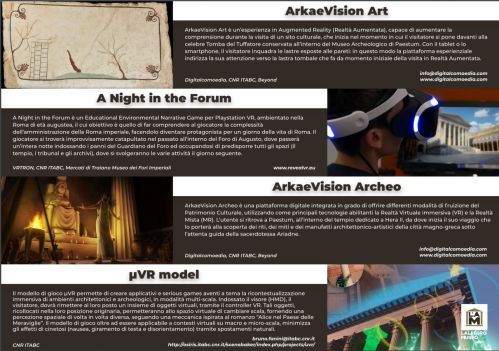 In tale contesto l'Itabc presenterà alcune innovazioni nel settore della comunicazione storico-archeologica grazie ad un percorso esperienziale che permetterà all'utente di compiere un viaggio alla scoperta di alcuni monumenti che saranno fruibili tramite la realtà virtuale (VR) immersiva e la realtà aumentata (AR).