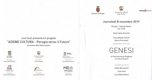 Mercoledì 6 novembre a Perugia, presso la Sala dei Notari, si terrà la presentazione del volume 'Genesi' di Pierfrancesco Pingitore e Franco Venanti edito da Futura Edizioni (con testi a cura di Guido Barlozzetti, Lino Conte e Luca Gammaitoni).