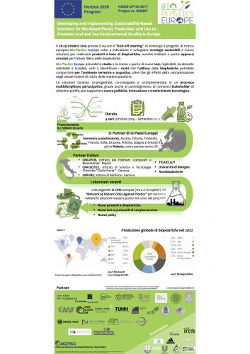 The National Research Council of Italy (Cnr), with its research Institutes Ipcb, Scitec and Ibf - is partner of "Bioplastics Europe", a european project coordinated by HAW Hamburg, involving 21 partners from 10 European countries and 1 extra-EU partner (H2020 Project No. 860407). The project aims at defining and developing sustainable strategies and new solutions towards bioplastics-based products, as well as at outlining circular approaches for the bioplastics supply chain. The consortium working at the European project represents an influential task force which provides a variety of competences coming from research organizations, trade associations, universities and companies.