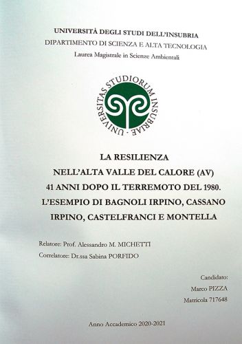 L’elaborato di tesi ha avuto come obiettivo lo studio degli effetti causati dal sisma Irpino-Lucano del 23 novembre 1980 su quattro comuni della Campania: Bagnoli Irpino, Cassano Irpino, Castelfranci e Montella, in provincia di Avellino, analizzando gli effetti ambientali ed il livello di danneggiamento sul costruito. Grande risalto è stato dato alla tematica della “Resilienza”, ovvero la capacità di una comunità di raggiungere un adattamento positivo a fronte di un evento drammatico, come quello che colpisce chi ha vissuto l’esperienza di un forte terremoto. È estremamente simbolico che nel giorno in cui si commemora l’anniversario del terremoto del 6 Aprile 2009 a L’Aquila, l’Associazione delle famiglie degli studenti universitari vittime del terremoto consegnino un premio di laurea a un dottorando ed ex-studente magistrale dell’Insubria, che ha analizzato il catastrofico terremoto del 1980 in Irpinia evidenziando che lo studio e la ricerca degli eventi passati mostrano la strada per il futuro dopo una catastrofe sismica.