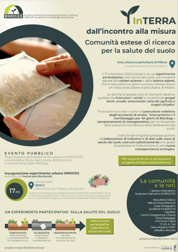 “InTerra”, come è stata battezzata l’attività sperimentale collettiva, avrà un serie di appuntamenti di avvio che si terranno tra il 16 e il 25 settembre in diversi luoghi della zona urbana e periurbana di Milano, parchi, orti, giardini, suoli pubblici, scuole, piccoli appezzamenti di terreno. In ciascun sito, grazie al coinvolgimento della preziosa rete di BRIDGES fatta di ricercatori e di associazioni, aziende agricole, comunità e scuole, i partecipanti coinvolti potranno sperimentare alcune tecniche di osservazione e misura.