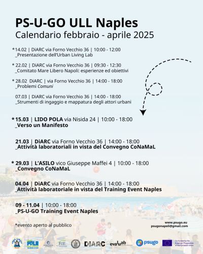 Le attività laboratoriali con studenti e studentesse dell’Urban Living Lab proseguiranno a marzo, in vista del Convegno del Comitato Nazionale Mare Libero, che si svolgerà il 29 marzo a Napoli presso l’ex Asilo Filangieri. In questa occasione, il progetto PS-U-GO e le attività sviluppate a Napoli saranno presentate a livello nazionale.
