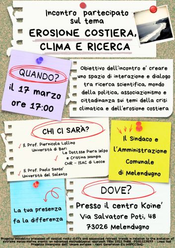 L’incontro si propone di creare uno spazio di confronto e dialogo tra comunità scientifica, istituzioni, associazioni e cittadinanza sui temi dell’erosione costiera e della crisi climatica. Un’occasione per approfondire sfide e soluzioni legate alla tutela delle coste, con un focus particolare sul territorio di Melendugno, comune della provincia di Lecce, caratterizzato da un litorale interessato dai fenomeni di erosione.