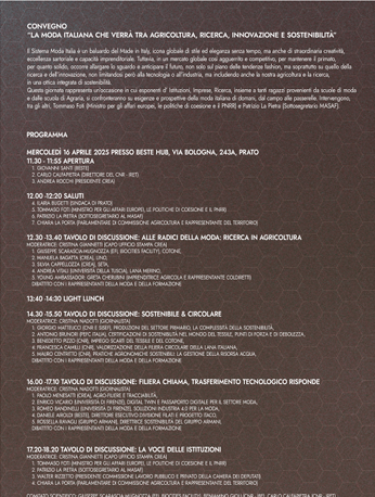 Innovazione, sostenibilità, agricoltura, circolarità: come impattano questi temi sulla moda di domani? E su quali aspetti la ricerca già oggi sta lavorando? Sono questi i principali temi che verranno affrontati durante questo appuntamento che intende essere una giornata di confronto partecipato sulle esigenze, le prospettive e le sfide del sistema della moda italiana.