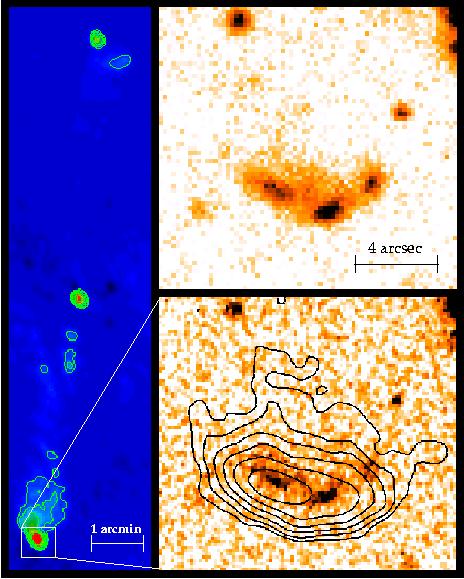 In tali HS gli elettroni che emettono radiazione ottica dovrebbero sopravvivere piu' a lungo che in quelle brillanti e con campi magnetici alti. Il risultato netto delle nostre ricerche e' stato quello di ottenere un tasso di detezione ottica di HS senza precedenti (del 70 %) e di duplicare il numero di HS ottiche conosciute. Di particolare rilevanza sono stati i risultati ottenuti nel caso dell'HS sud delle radio galassia 3C 445. L'emissione ottica di questa HS e' stata risolta in alcune regioni compatte (Fig. 1) dove gran parte dell'energia cinetica del getto e' dissipata in accelerazione di particelle relativistiche. In particolare il knot centrale in Fig. 1 e' la regione in cui avviene l'impatto fra il getto e il mezzo intergalattico: in tale regione si forma un'onda d'urto che puo' accelerare elettroni relativistici tramite processi di tipo Fermi I.