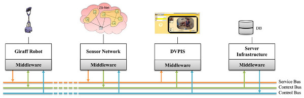 GiraffPlus comprende un sistema integrato di sensori per il monitoraggio delle attività nelle abitazioni che raccoglie dati ambientali e fisiologici unitamente alla presenza di un robot di telepresenza semi-autonomo che permette la visita virtuale da remoto all'anziano.