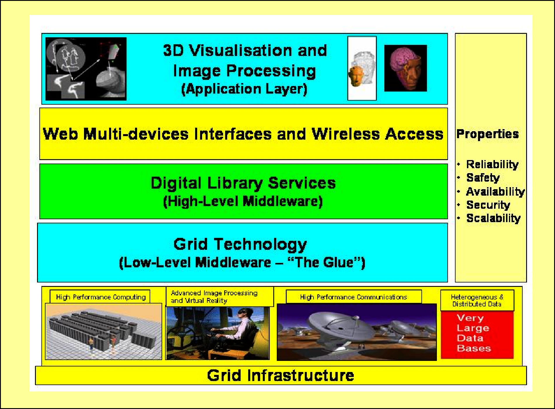 · Il secondo livello ((Grid Technology, o Low-Level Middleware).ha la funzione di virtualizzare le risorse e costituisce "il collante" del sistema. Esso realizza un nucleo di servizi come la gestione remota dei processi, l'allocazione coordinata delle risorse, l'accesso alla memoria, la ricerca dell'informazione, i servizi di sicurezza, ecc.