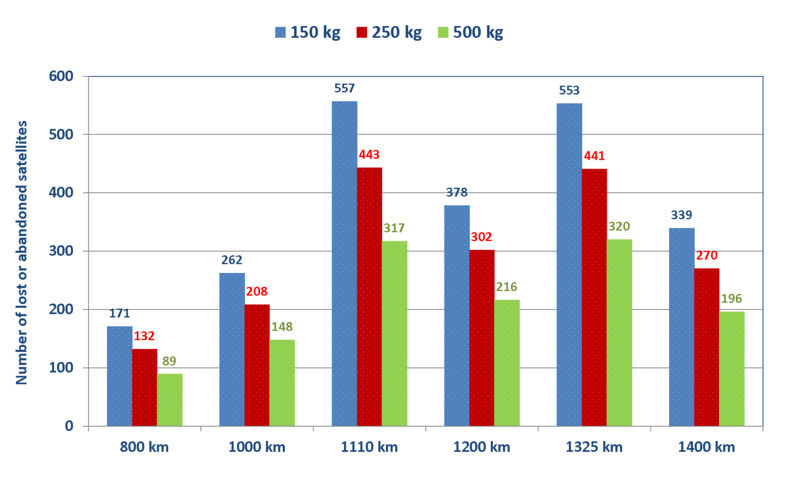 Prendendo in considerazione le nuove costellazioni pianificate tra gli 800 e i 1400 km (costituite da circa 6000 satelliti), ci si potrebbe aspettare un aumento di quasi il 20-30% del tasso di collisione totale tra gli oggetti catalogati in LEO, ipotizzando che ogni satellite della costellazione sia immediatamente deorbitato a fine vita con una probabilità di successo del 90%. Ovviamente, un maggior numero di satelliti, e/o una probabilità di successo inferiore della loro rimozione a fine vita, avrebbero un impatto ancora più negativo sull'ambiente. Inoltre, se i numerosi satelliti rimossi dalla costellazione non venissero deorbitati immediatamente, o in un tempo relativamente breve, il tasso di collisione in LEO aumenterebbe ulteriormente, almeno a medio termine, a meno che i satelliti non continuino ad essere controllati e manovrabili fino a quando non rientrino nell'atmosfera. Ad esempio, se mille satelliti fossero collocati su orbite ellittiche di 300 x 1000 km, il tasso di collisione tra gli oggetti catalogati in LEO potrebbe crescere di un ulteriore 30% durante i pochi anni necessari ai satelliti per decadere.