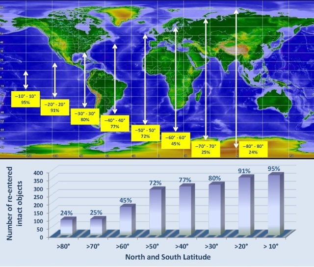 Nel 4% di questi rientri si suppone che l'aspettativa di vittime al suolo abbia superato di circa un ordine di grandezza la soglia di attenzione di 10^-4 per evento. In quasi l'84% dei casi l'aspettativa di vittime è stata probabilmente dell'ordine di 10^-4. Solo nel 12% dei casi l'aspettativa di vittime è stata significativamente inferiore. Tenendo conto della distribuzione delle inclinazioni orbitali e delle latitudini sorvolate, si è riscontrato che il territorio italiano avrebbe potuto essere interessato dalla caduta di eventuali frammenti in circa il 77% dei casi e l'Europa continentale in circa l'80% dei casi.