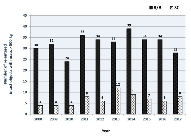 Più di 24.400 oggetti orbitanti sono rientrati finora nell'atmosfera terrestre dall'inizio dell'era spaziale. La massa associata, circa 30.000 tonnellate, è rientrata soprattutto con satelliti e stadi orbitali, che assieme hanno rappresentato poco meno del 29% dei rientri catalogati. Durante i 10 anni che vanno dal 2008 al 2017, 448 oggetti di grandi dimensioni (cioè con una sezione trasversale radar > 1 m2), che includevano 366 stadi orbitali (<82%) e 82 satelliti (<18%), sono rientrati senza controllo nell'atmosfera terrestre. Complessivamente avevano una massa di circa 911 tonnellate, l'83% concentrata negli stadi e il restante 17% nei satelliti. Ogni anno sono quindi rientrate, in media, circa 90 tonnellate. Oggetti di massa superiore ai 500 kg sono rientrati, mediamente, ogni 9 giorni, mentre quelli con massa superiore ai 5000 kg ogni 215 giorni circa.