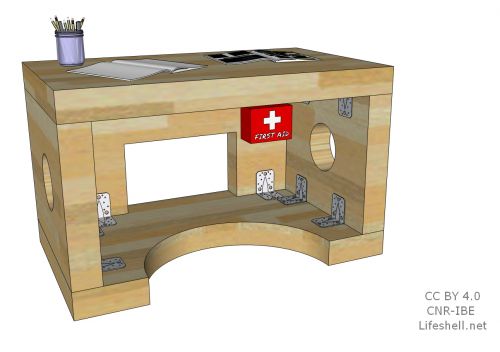 Pensato principalmente come un banco per uso scolastico, questi mobili sono sviluppati in varie versioni anche per uso residenziale, ufficio, officina e anche come letti e armadi, sempre con una doppia funzionalità antisismica. Sono accessoriati con un kit di pronto soccorso, radio, lampadina tascabile, mascherina antipolvere, fischietto. Sono costruiti in legno, un materiale rinnovabile e riciclabile, possono essere prodotti anche utilizzando i sottoprodotti delle lavorazioni delle case in legno, in un’ottica di bioeconomia, economia circolare e di riduzione dei rifiuti. Sono molto economici e possono essere costruiti anche in kit fai da te. Sono stati testati con successo all’impatto di un blocco di cemento da 2800 kg lasciato cadere da 1,5 m di altezza, che ha sviluppato un’energia di 40.000 joules.