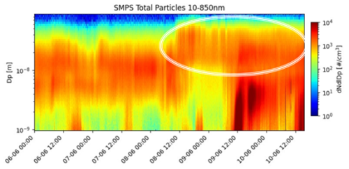 The observed aerosol particles number size distribution shows an additional and persistent accumulation mode (ranging between 100 nm and 1 µm), suggesting that aerosol particles were modified by aging processes and grew during their long transatlantic journey. The observed shift in particle size, compared to smaller “fresh” particles, indicates that these aerosols experienced chemical and physical transformations during long-range transport.