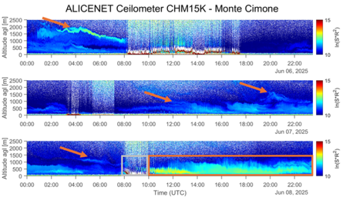 An additional piece of evidence came from observations made using the ceilometer of the ALICE-Net infrastructure. This instrument monitored, between June 6 and 8, the presence of aerosol-rich atmospheric layers at high altitude, well before they reached the surface of Monte Cimone. The ceilometer signal showed the gradual arrival of the plume, visible as filamentous layers with medium to high values consistent with combustion aerosols.