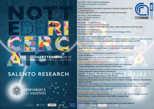 Per informazioni: Gabriella Zammillo, CNR-Nano Lecce, via Arnesano 17, tel 0832.298103, email: gabriella.zammillo@unisalento.it