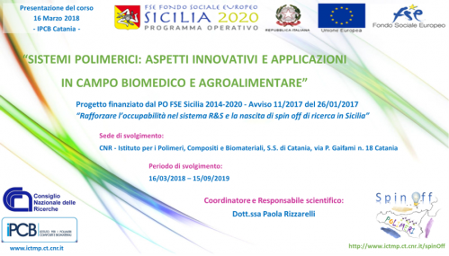 Il percorso di formazione, della durata di 18 mesi, è stato erogato nell’ambito del progetto denominato 'Sistemi polimerici: aspetti innovativi e applicazioni in campo biomedico e agroalimentare' (SPIN OFF Polimeri), finanziato all'Istituto per i polimeri, compositi e biomateriali del Cnr (Ipcb-Cnr) di Catania, dal PO FSE Sicilia 2014-2020 - Avviso 11/2017 del 26/01/2017 - Rafforzare l’occupabilità nel sistema R&S e la nascita di spin off di ricerca in Sicilia (Fig. 2).