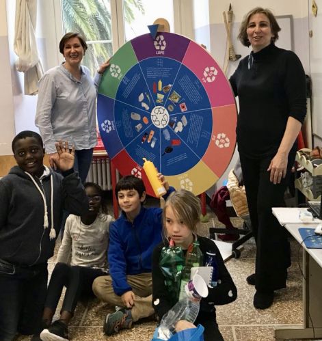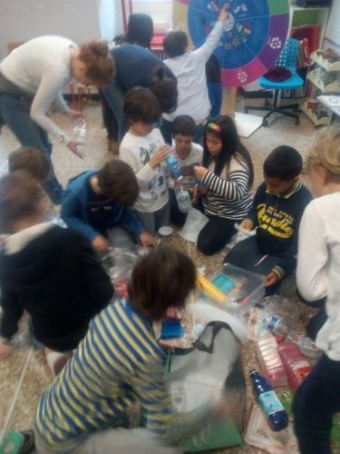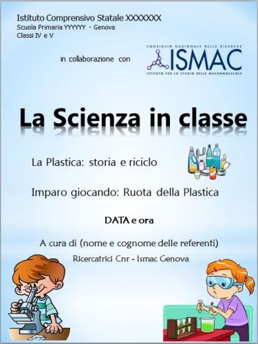Parte ludica: Ismac porta in aula la Ruota della Plastica corredata del ‘cesto degli oggetti’, vedi immagine. La classe viene divisa in squadre da un arbitro, queste gareggiano come in un gioco (bandiera, staffetta, ecc) in cui un componente di una delle squadre o l’arbitro stesso gira la ruota. Quando la ruota si ferma, la freccia indicherà lo spicchio dedicato ad uno delle 7 principali tipologie di plastica che abbiamo a casa, a scuola o in ufficio e che vanno smaltite. A questo punto i componenti delle squadre avversarie si precipitano verso gli oggetti, contenuti nel cesto o disposti a terra, alla ricerca della tipologia di plastica sorteggiata. Vince chi la individua e chi lo riesce a fare in minor tempo. Si riserva maggior spazio al gioco nelle attività con le classi primarie. Le ricercatrici e i ricercatori che animano di volta in volta i laboratori con le scuole, per ogni evento declineranno le attività applicando proprie modalità e adeguandosi alle esigenze specifiche del momento o logistiche della scuola.