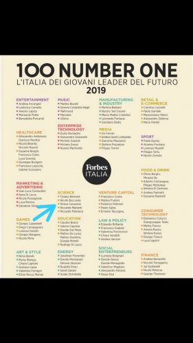 La classifica di 'Forbes Italia', l'edizione italiana del prestgioso magazine dedicato a cultura economica, leadership imprenditoriale e innovazione, è pubblicata sul numero di aprile: Teresa Maria Carusone è stata menzionata -unica donna- nella categoria 'Science'.
