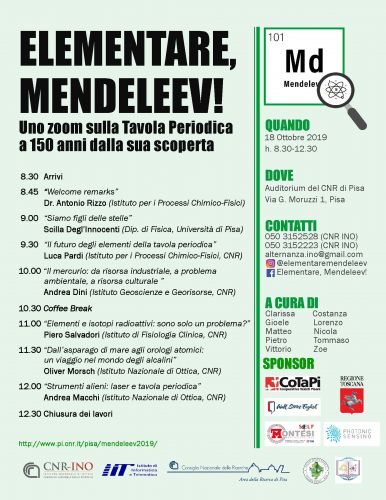 Maggiori informazioni sul convegno e le presentazioni dei relatori sono disponibili alla pagina web, anche questa curata dagli studenti organizzatori, http://www.pi.ino.cnr.it/pisa/mendeleev2019/.