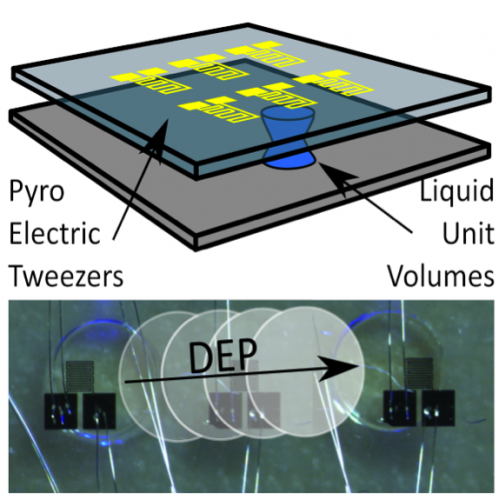 Tutte le soluzioni fino ad ora proposte sono basate sull’impiego di campi magnetici, ottici ed elettrici, e risultano complicate e molto costose. In risposta a queste esigenze un team di ricercatori dell’Istituto di Scienze Applicate e Sistemi Intelligenti (Isasi) del Cnr, ha proposto un semplice principio per la manipolazione di liquidi ed una piattaforma innovativa per la gestione senza contatto guidata dall’ “intelligenza fisica”. Con intelligenza fisica si intende una nuova modalità di offrire una risposta in funzione di sollecitazioni esterne. In particolare, la tecnologia proposta dai ricercatori è basata sull’utilizzo di una materiale piroelettrico che può generare un campo elettrico in risposta ad una variazione di temperatura, per effetto di una proprietà costitutiva del materiale. Tale campo elettrico è impiegato per il controllo, la manipolazione e la gestione di volumi di liquidi. Infatti, il campo elettrico, generato per effetto piroelettrico, consente di attivare e spegnere il sistema di controllo e movimentare volumi di liquido senza contatto. Questa tecnologia potrebbe essere integrata in sistemi di tipo lab-on-chip per applicazioni su piccoli volumi (micro) e volumi più grandi (macro).